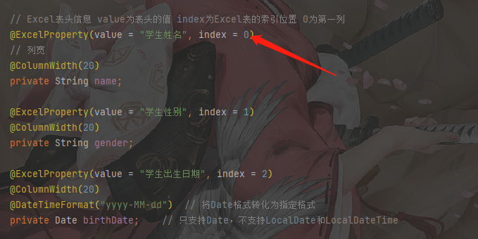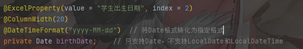 @ExcelProperty(value = "学生出生日期", index = 2) @ColumnWidth(20) private Date birthDate;
