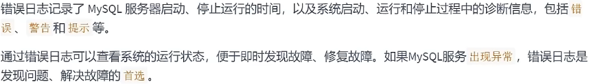 - 错误日志:记录MySQL服务的启动、运行或停止MySQL服务时出现的问题,方便我们了解服务器的 状态,从而对服务器进行维护。