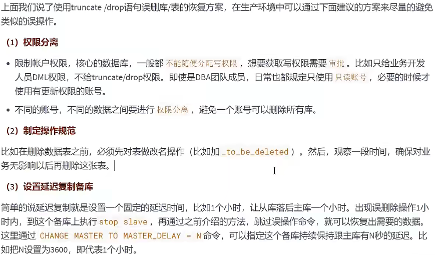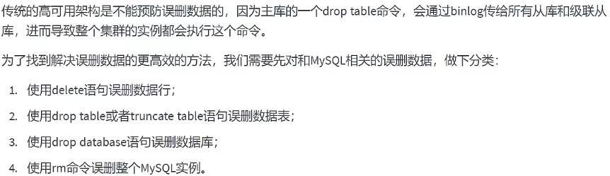 对于一个有高可用机制的MySQL集群来说,不用担心 rm删除数据 了。只是删掉了其中某一个节点的数据的话,HA系统就会开始工作,选出一个新的主库,从而保证整个集群的正常工作。我们要做的就是在这个节点上把数据恢复回来,再接入整个集群。